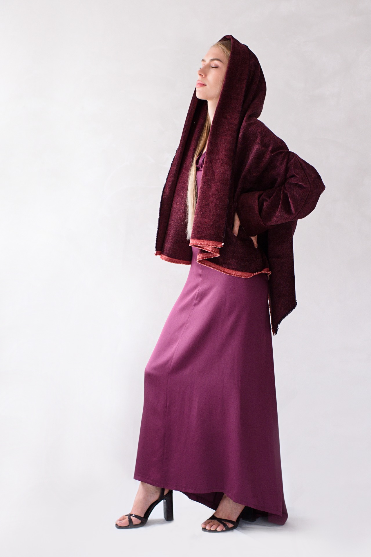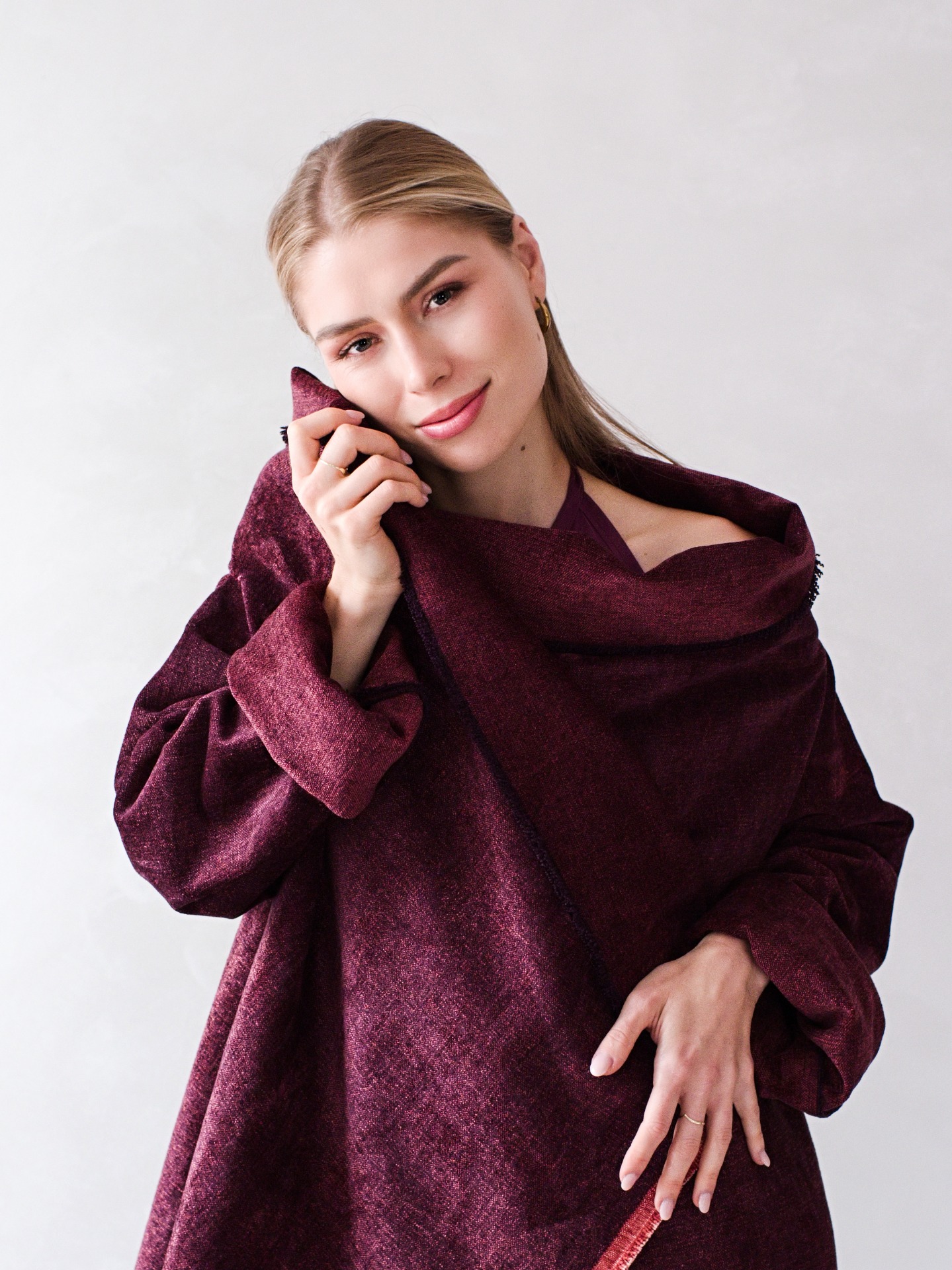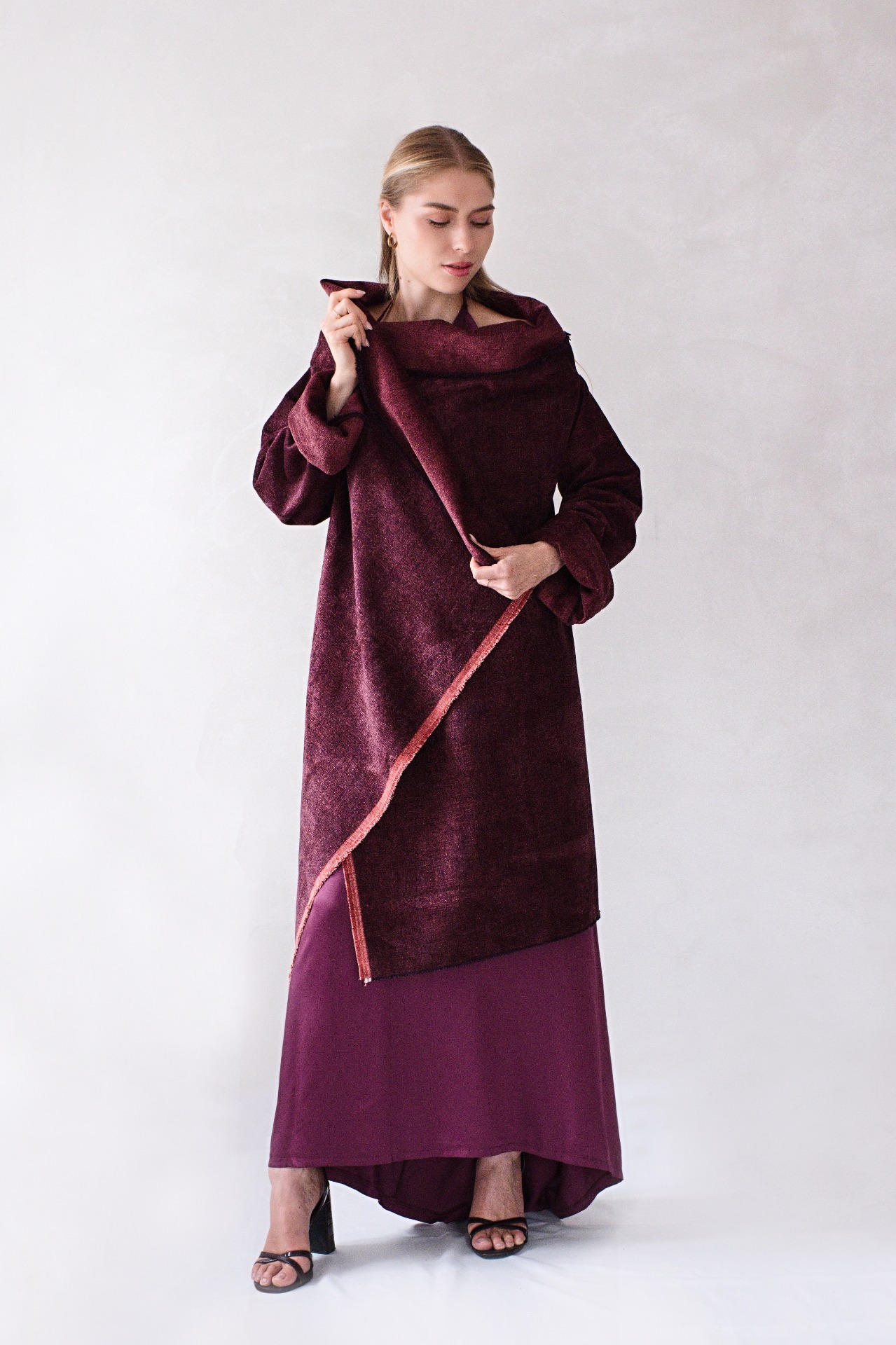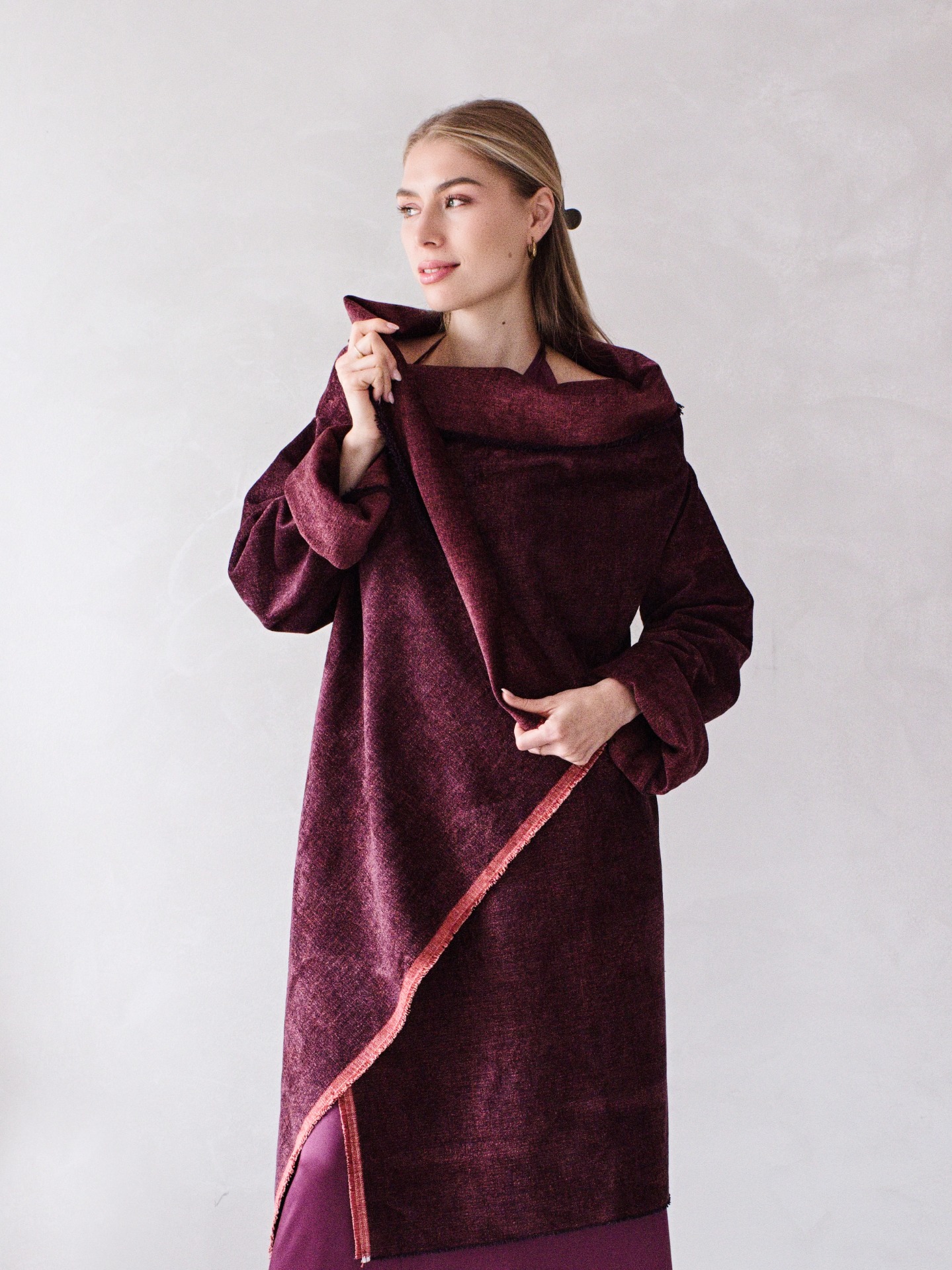 Unikátní kabát, nebo také plást. Můžeme jej nosit dvěma způsoby buď dlouhý, a nebo kratší s kapucí - pouhým přetočením oděvu.
